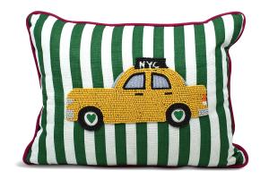 Pillow Green/White Stripes w/Beaded Yellow Taxi Cab & "New York"