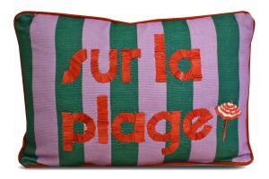 Pillow Purple & Green Stripe Emboridered "sur la plage"