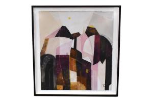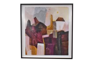 Print Abstract Pink, Purple & Black w/Houses in Black Frame (Cleared)