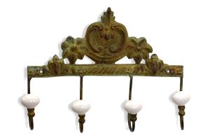 Wall Hook Antique Brass Ornate w/Porcelain Knobs