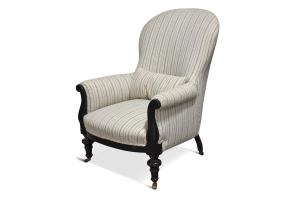 Chair Bergère Blue/Grey Micro Stripes on Cream w/Kidney Pillow, Dark Wood Frame & Casters