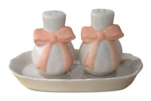 Salt & Pepper Shakers on White Ceramic Tray w/Pink Bow